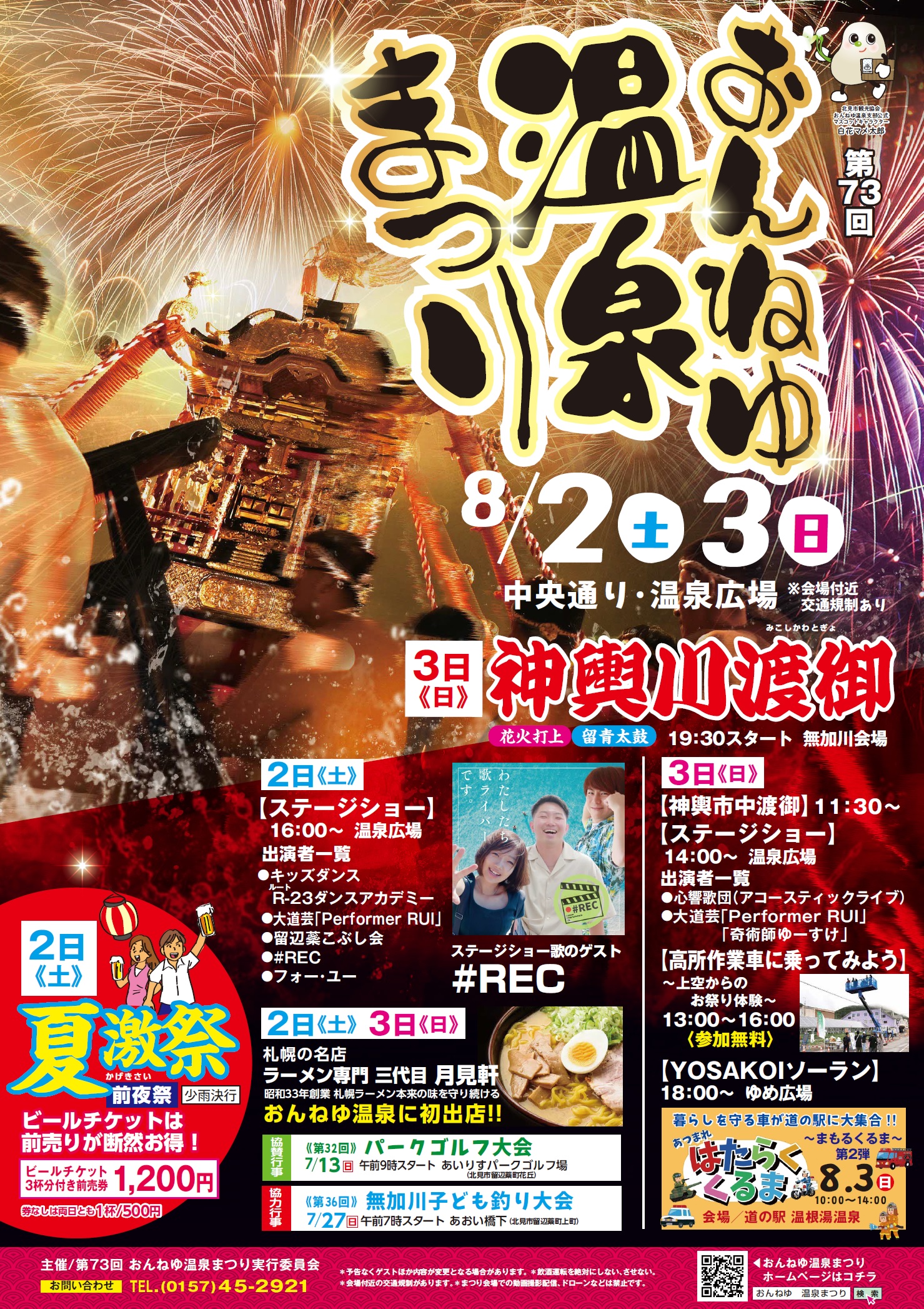 | 日時 | 令和7年(第73回) 8月2日(土) 16:00~21:00 露店街「湯けむり縁日」 【温根湯温泉イベント広場】 16:00~21:00 夏激祭(ビールパーティ) 【温根湯温泉イベント広場】 ・ビール3杯で1,200円の前売り券あり。ソフトドリンクとの交換も可能。(当日は1杯500円) 16:00~20:00 ステージショー 【温根湯温泉イベント広場】 ★出演者一覧 (1)キッズダンス ・R-23ダンスアカデミー (2)大道芸「Performer RUI」 (3)留辺蘂こぶし会 (4)蝦名容子 (5)#REC 18:30~19:30 夕涼み子どもの集い【温根湯中央通り】 8月3日(日) 11:30~ 神輿市中渡御・子ども神輿 【市中】 13:00~20:00 露店街「湯けむり縁日」 【温根湯温泉イベント広場】 14:00~ ステージショー 【温根湯温泉イベント広場】 ★出演者一覧 (1)心響歌団(アコースティックライブ) (2)大道芸 ・Performer RUI ・奇術師ゆーすけ 18:00~ YOSAKOIソーラン 【温根湯温泉イベント広場】 19:30~20:50 川行事「水神・火神のつどう処」 【無加川沿い特設会場】 ・神輿川渡御 ・打上花火 ・和太鼓演奏 |